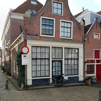Hoekpand met in blokken gepleisterde lijstgevel. Dakkapel met omlijsting. XIX.