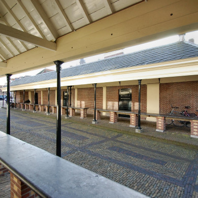 Vismarkt. Twee evenwijdig geplaatste, langwerpig rechthoekige gebouwtjes met omgaande kroonlijsten onder met leien gedekte schilddaken, aan de open, lange, naar elkaar toegewende zijden rustend op ijzeren kolommetjes; de gesloten wand van het gebouwtje aan de zijde van het Verdronken Oord geleed door pilasters, beelden (XVII B) van een visser en een visvrouwtje op het dak van laatstgenoemd gebouwtje. XIX A.