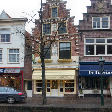 Pand met in cartouche 1607 gedateerde, bakstenen trapgevel; toppilaster op kraagsteen met leeuwenkop tussen voluten; de bovenste trede geflankeerd door natuurstenen voluten. Rijke toepassing van natuursteen in de vorm van geprofileerde waterlijsten en dito dekplaten op de treden, van hoekblokken, van blokken en sluitstenen met gebeeldhouwde maskers in de ontlastingsbogen en in de strekken boven de vensters. Sierankers. Gevelsteen. Winkelpui.