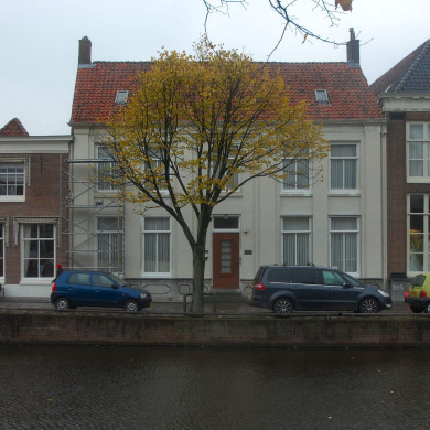 Pand gedekt door drie onderling evenwijdige schilddaken; lijstgevel op plint. Gesneden deur en een bovenlicht met spiegelboog in een deuromlijsting met smalle getoogde lichten in de posten, de laatste voorzien van een gesneden ornament. Stoep.