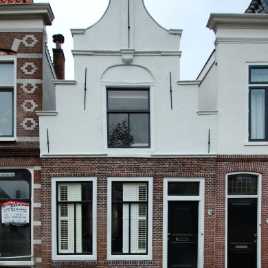 Vijf traveeën breed pand; lijstgevel op natuurstenen basement; de lijst voorzien van trigliefen, modillons en consoles; geblokte gepleisterde zijlisenen; risaliet van de middentravee waarin een gesneden deur, een dito kalf en een fraai snijraam in een omlijsting met geblokte lisenen, consoles en