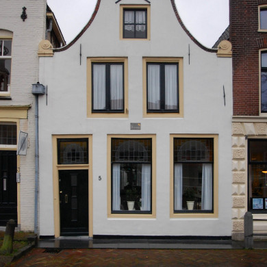 Vier traveeën breed PAND onder schilddak; dakkapel bekroond door segmentboogvormig fronton. Lijstgevel, gesneden consoles op de lijst. Twaalfruitsschuifvensters, natuurstenen vensterdorpels. Voordeur omlijstingen met bovenlicht. Stoep met kwartcirkelvormige hekken. XIX A.
