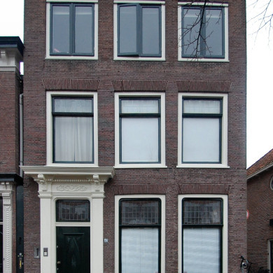 Pand met drie traveeën brede lijstgevel; zijlisenen, risaliet van de middentravee. Zes- en vierruitsschuifvensters met middenstijl, XIX.