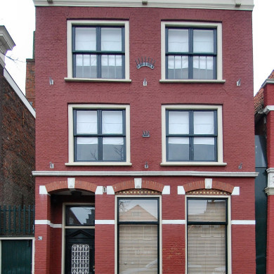 Pand met een tot tuitgevel verminkte topgevel; fries met gebeeldhouwde leeuwenmaskers op de uiteinden en met gevelsteen boven de beganegrond, geprofileerde natuurstenen waterlijsten en speklaag, korfboogvormige ontlastingsbogen met natuurstenen aanzet- en sluitstenen en verdiepte boogvelden boven