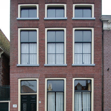 Pand met een tot tuitgevel verminkte topgevel; fries met gebeeldhouwde leeuwenmaskers op de uiteinden en met gevelsteen boven de beganegrond, geprofileerde natuurstenen waterlijsten en speklaag, korfboogvormige ontlastingsbogen met natuurstenen aanzet- en sluitstenen en verdiepte boogvelden boven