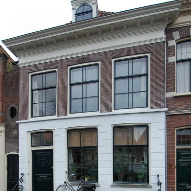 Pand met lijstgevel; trigliefconsoles op de lijst. Dakkapel met halfrond bovenlicht. Stoep. XIX.