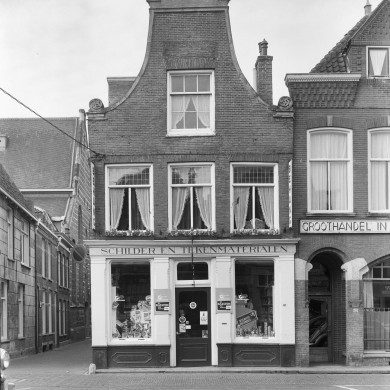 Pand met lijstgevel. Tweede verdieping met vierruitsschuifvensters. Moderne winkelpui. XIX.