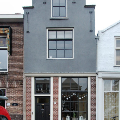 Pand met gepleisterd trapgeveltje; toppilaster op gebeeldhouwde kraagsteen. Geprofileerde natuurstenen dekplaten op de treden. Ankers en hijsanker. XVII