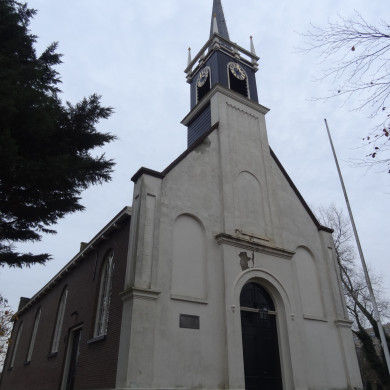 Eenvoudig zaalkerkje ter plaatse van middeleeuws kerkgebouw, in 1858 grotendeels herbouwd met behoud van laat 16e eeuwse kap. Voorgevel 1867 na afbraak van de in 1858 gespaarde toren. Dakruiter uit 1884. Orgel met Hoofdwerk en Bovenwerk, in 1877 gemaakt door L. Ypma.