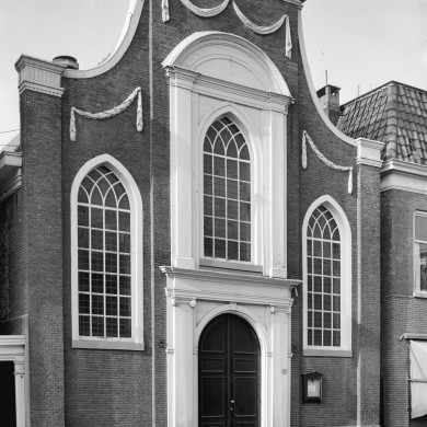Winkelpand met halsgevel (XVIII). De gevel is omstreeks 1935 geheel opnieuw opgetrokken in oude vormen en met gebruikmaking van oude onderdelen, met name de natuurstenen topomlijsting en de gebeeldhouwde gevelsteen in de top. Moderne winkelpui.
