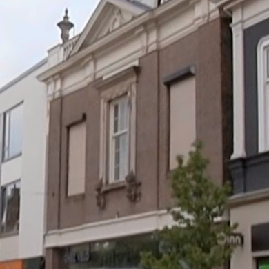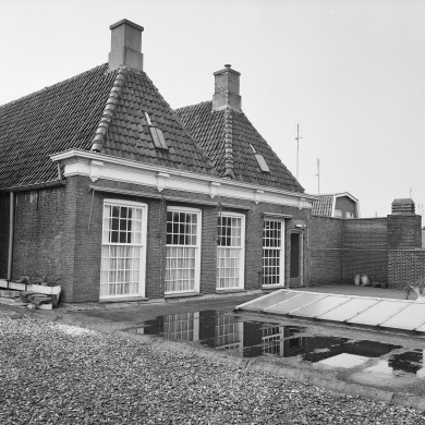 Winkelpand met halsgevel (XVIII). De gevel is omstreeks 1935 geheel opnieuw opgetrokken in oude vormen en met gebruikmaking van oude onderdelen, met name de natuurstenen topomlijsting en de gebeeldhouwde gevelsteen in de top. Moderne winkelpui.