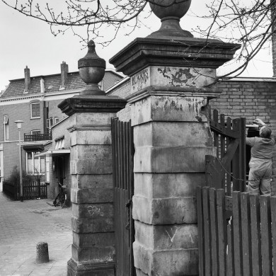 Twee Bentheimer-stenen poortpijlers. Door vazen bekroond, XVIII A.