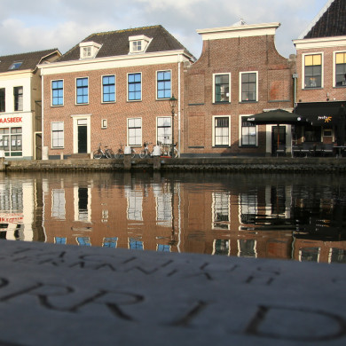 Herenhuis, midden 18e eeuw met verdieping en hoog, pannen schilddak, waarop hoekschoorstenen. Dakkapel. Houten middenpartij, waarin deuromlijsting met gecanneleerde pilasters en hoofdgestel en palmetkapitelen. Bovenvensters met zijstukken en hoofdgestel. Vensters met zesruitsschuiframen.