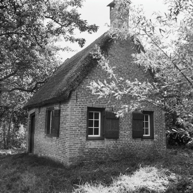 KOOIKERHUISJE onder rieten zadeldak, eerste helft 19e eeuw.