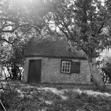 SCHUUR van nr 7 en 9 onder hoog rieten dak met dakvenster.