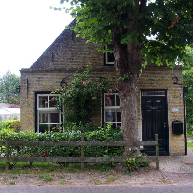 Karakteristiek Amelander huis uit 1699 met rode bakstenen bogen boven de vensters en ingang.
