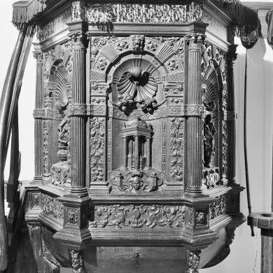 De in 1832 opgetrokken kerk vanwege een bijzonder rijk gesneden preekstoelkuip, gemerkt en gedateerd: A. Jelles 1604; afkomstig uit Harlingen.