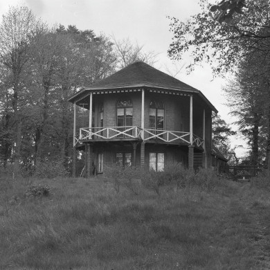Koepel op de Hazenberg. Open waranda op houten zuilen en rieten dak. Gekartelde daklijsten. Voor stenen woning.