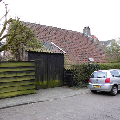 Schuur, 19e eeuw, met pannen zadeldak tussen stenen puntgevels en gepotdekselde zijwanden.