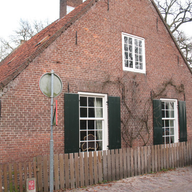 Eenvoudige 19e eeuwse boerderij, langhuis, met topgevel. Witgeschilderde gesneden daklijst.