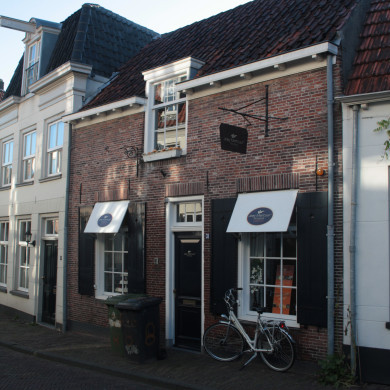 Huis met gepleisterde Gelderse topgevel. XVII. Achtergevel in baksteen met kruiskozijnen en luiken.