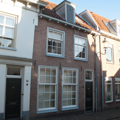 Huis met gepleisterde Gelderse topgevel. XVII. Achtergevel in baksteen met kruiskozijnen en luiken.