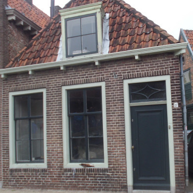 Annex de Koppelpoort de voormalige Volmolen. Rechthoekig gebouw met kruisvensters en halve luiken, aan de stadsgracht bij de sluizen gelegen. 17e eeuw.