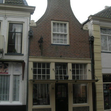 "De gekroonde Byenkorf". Huis met halsgevel met op de uiterste hoeken vazen, beeldhouwwerk, guirlandes en jaarlint 1687. Pakhuis in de Coninckstraat.