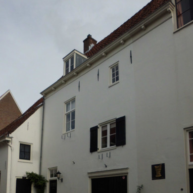 Huis met gepleisterde lijstgevel 1660. In de zijgevel twee gevelsteentjes.