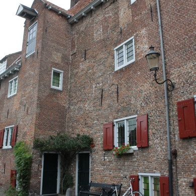 Pand, deel uitmakend van groep van vijf woningen. Statige hoge gevel met steil zadeldak uit de 16e eeuw. Aan de singelzijde gemetselde bogen en lisenen.