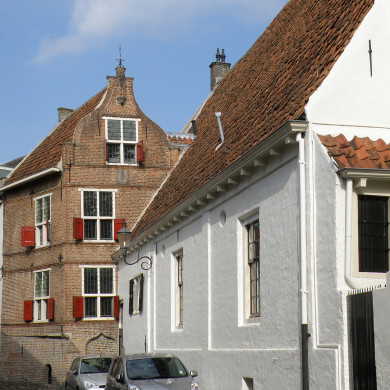 Witgepleisterd laag huis met hoog zadeldak en uitbouwen. Dakkapel door daklijst snijdend met hijsbalk. Zet zich voort in een huis met gezwenkte halsgevel met pinakels versierd; kruisvensters en een benedenhuis door accoladen-boog bekroond omstreeks 1600. Gecombineerd met gevel aan de Nieuwe weg.