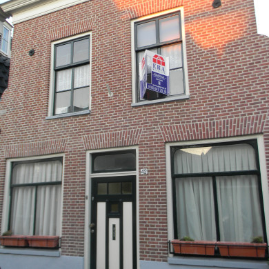 Fraai hoogoprijzend huis met strakke kroonlijst en twee mooie dakvensters, 18e eeuw, beneden enigszins ongelukkig verbouwd.