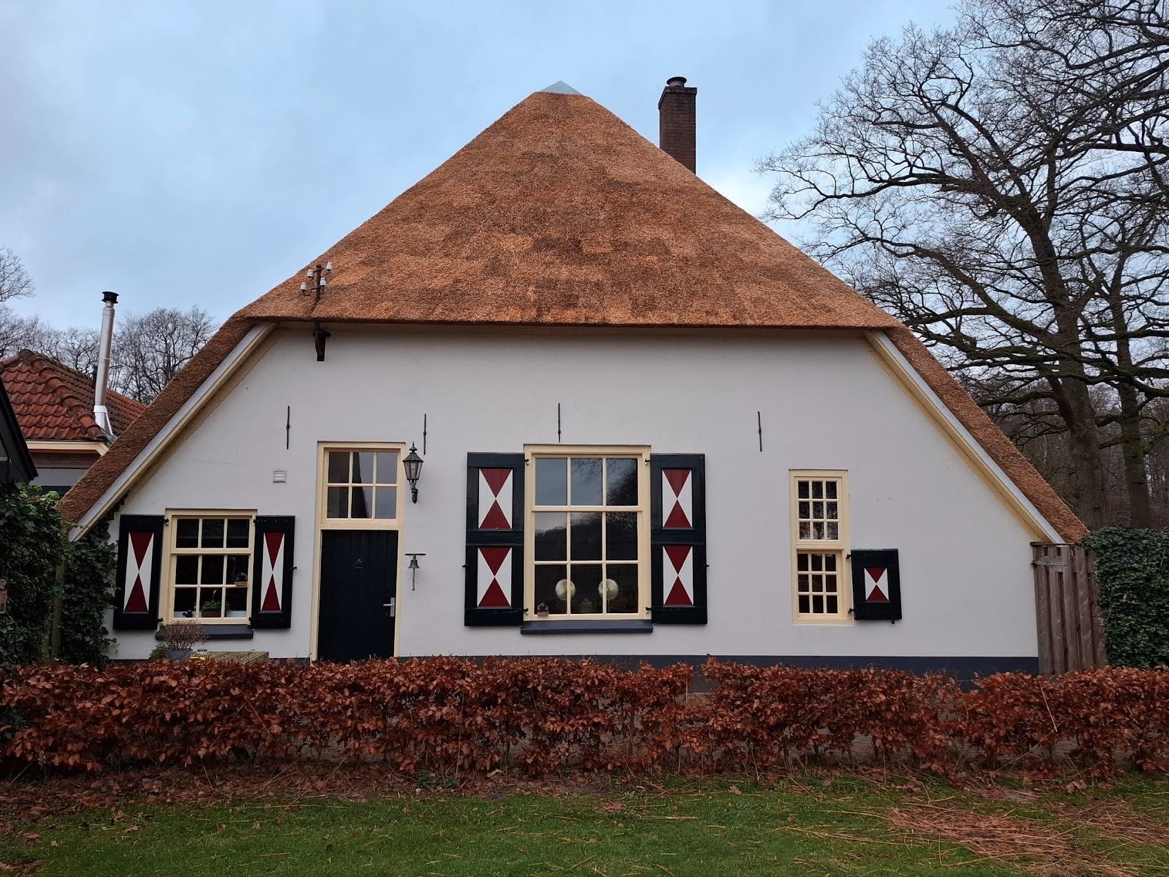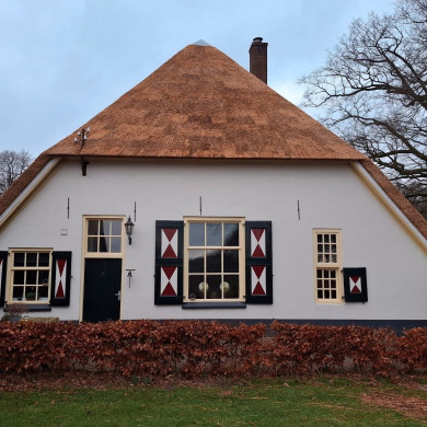 Boerderij, blijkens jaartal op de sluitsteen boven de staldeuren uit 1826. Rieten wolfdak, vensters met oude kozijnen en luiken. Wagenschuur, bakhuis en houten karnmolen.