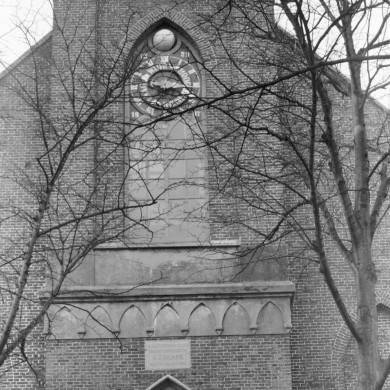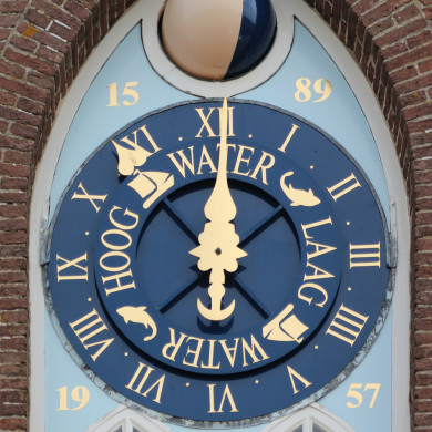 Nederlands Hervormde kerk met een eb- en vloedklok, eerste helft zeventiende eeuw, op de kerktoren voor het aangeven der getijden. Herplaatst in de toren van de uit 1858 daterende Nederlands Hervormde Kerk.