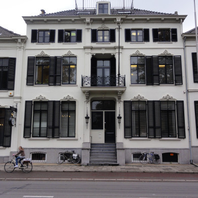 Huis met gepleisterde lijstgevel (derde kwart negentiende eeuw) met stucversieringen en balkon. Gedeeltelijk nog schuif- en draairamen. Hoger middendeel met fronton. Deze en volgende gevels vormen samen de laatste rij gaaf bewaarde singelhuizen.