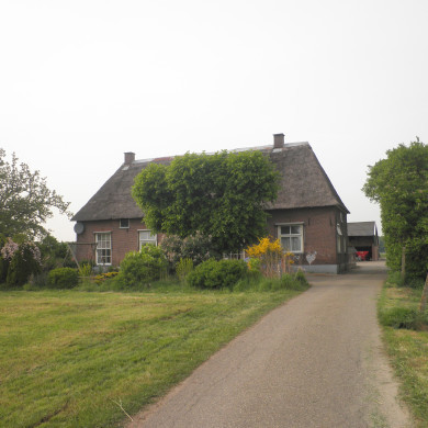 Boerderij met dwars woonhuis onder een met riet gedekt schilddak. Schuifvensters met strekken en roedenverdeling en met luiken behangen. Rechts opkamer. Zolderluiken. Pomp.