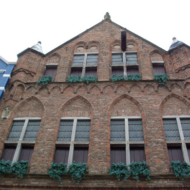 V.m. St. Petersgasthuis. Aanvankelijk als woonhuis vermeld in 1380, ingewijd als gasthuis 1407. Gotische gevel met kruisvensters en hangtorentjes met bakstenen spitsen. Zijmuren met weergangen en aan de westgevel een traptoren met klokkenverdieping. Inwendig grote voorzaal met balken op korbelen en gebeeldhouwde kraagstenen. Zaal op de verdieping eveneens oude balkenzoldering op korbelen. Aan de achterzijde trapgevel. Gerestaureerd 1954-1955, waarbij de onderpui werd gereconstrueerd.
