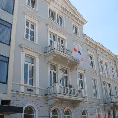 Onderdeel van de zgn. Fromberghuizen. Monumentale neo-klassicistische gevelwand (XIX c) met midden- en zijrisalieten en balkons op zware consoles boven de met stuc-rustica versierde parterre. Onder de kroonlijst voluut-consoles. De risalieten dragen frontons.