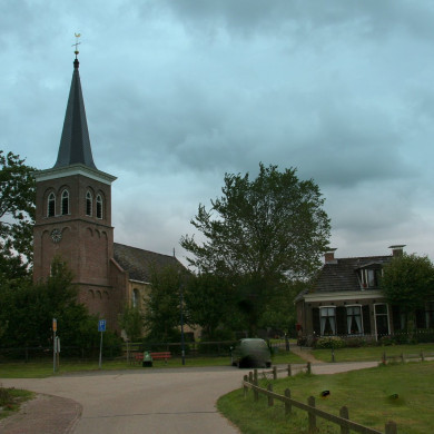 Herv. Kerk en kerkhof. Klein eenbeukig kerkgebouw van baksteen met halfronde sluiting, 15e eeuws met dakruiter boven de westgevel. In de kerk 17e eeuwse preekstoel, doophek en twee banken met bollen op de hoeken. Verlichting door middel van oliehanglampen. Orgel gemaakt door W. Hardorff.