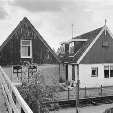 Woning aan de vaart onder zadeldak tegen topgevel met houten voorschot.