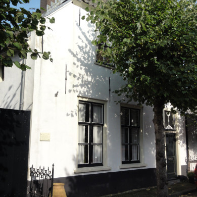 Gepleisterd PAND onder pannen wolfdak, laat-middeleeuws, met in de voorgevel beneden zesruitsschuiframen.