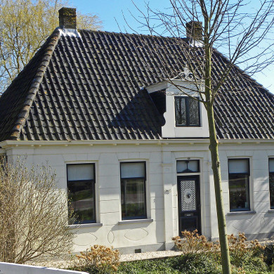 Eenvoudig bakstenen huis onder schilddak, gevel gepleisterd.
