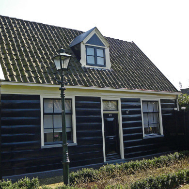 Houten huis onder dwars schilddak, voorgevel in baksteen.