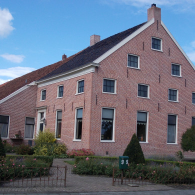 BOERDERIJ van het Oldambtster type. Voorgevel geleed door middenrisaliet en vier pilasters.
