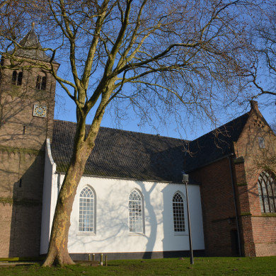 Herv. Kerk. Laat-gotische kerk met driezijdig gesloten koor, waartegen aan de zuidzijde een met netgewelven overdekte kapel. Het oorspronkelijk eenbeukige schip werd in 1834 met zijbeuken uitgebreid. Kruisribgewelven over het koor. Kerk en toren (apart monumentnummer 8938) gerestaureerd na beschadiging in 1944-'45. In het koor een gebeeldhouwde zerk uit 1621 voor de familie Van Gendt. Orgelkas tweede helft 18e eeuw, gewijzigd 1834 en bij de restauratie.
