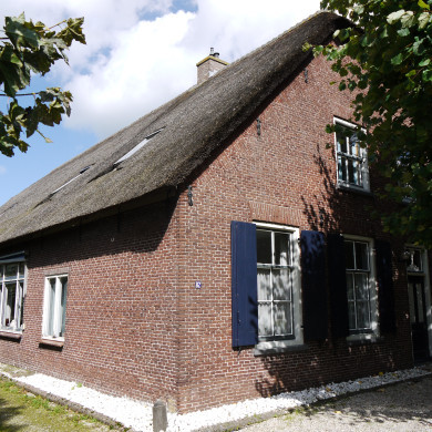 Gepleisterd langhuis; afgewolfde voorgevel, rieten dak, 18e eeuw.