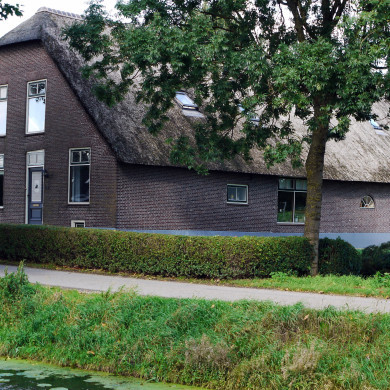 Boerderij, langhuis met afgewolfde voorgevel, rieten dak.