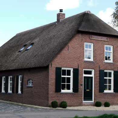 Boerderij, langhuis met afgewolfde voorgevel, rieten dak.