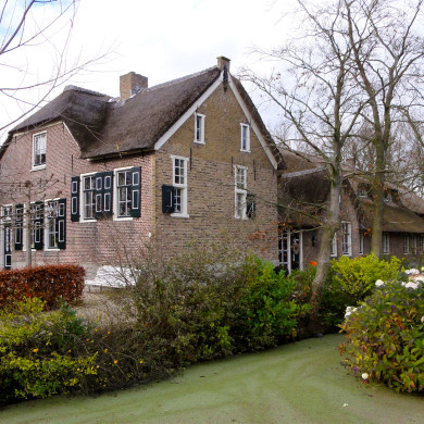 Grote boerderij uit de 17e eeuw met in de 19e eeuw vernieuwde voorgevel. Het woongedeelte heeft rechts een opkamer met puntgevel, waarin drie sierankers. Achter het woongedeelte, evenwijdig hieraan, een tweede vleugel met rieten wolfdak tussen puntgevels.