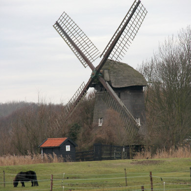 "Meerhoek". Op stervormige plattegrond met N.O.-aanbouw gedeeltelijk in baksteen met van gepotdekselde delen voorziene verdieping opgetrokken villa, oorspronkelijk genaamd "Meerhoek", onder golvende door schoorsteen bekroonde rieten kap, ontworpen in 1917-18 door C.J.